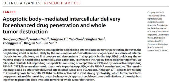 近期,356体育在线官网孙进教授和何仲贵教授课题组发现凋亡小体可以介导肿瘤细胞间的药物传递,借助于此可以增强纳米化疗药物的肿瘤渗透能力以实现肿瘤的全面杀伤。相关研究成果以“Apoptotic body–mediated intercellular delivery for enhanced drug penetration and whole tumor destruction”为题在线发表于Science系列子刊Sciences Advances (IF 13.116, DOI: 10.1126/sciadv.abg0880)。